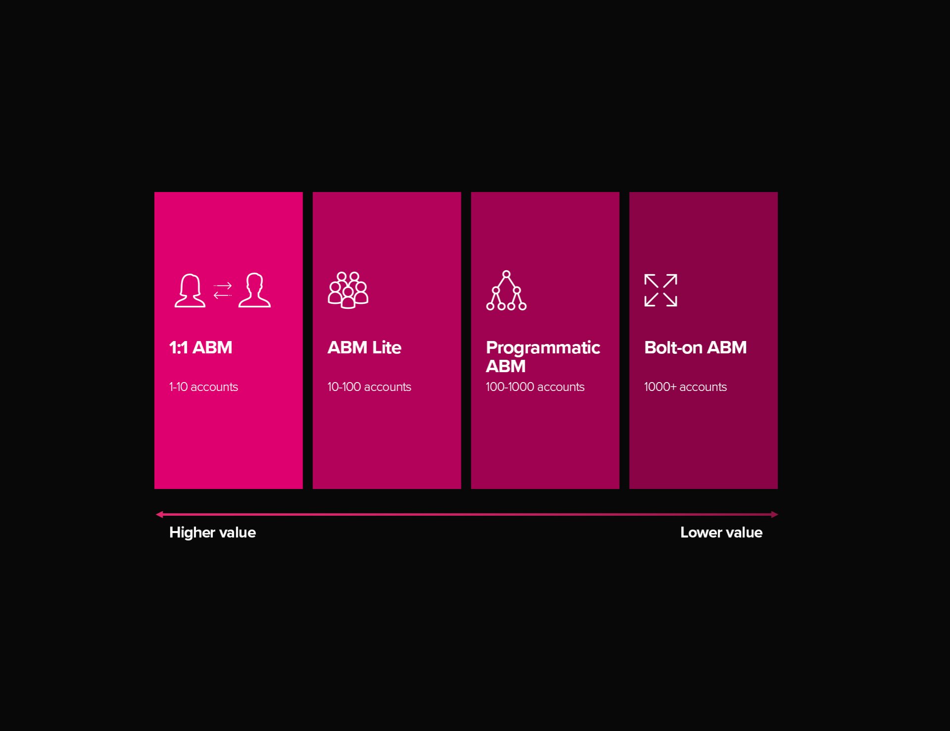 - Kiezen. We bepalen de (gepersonaliseerde) campagnes waarmee jouw marketingteam de accounts zal benaderen. Op inhoudelijk en creatief niveau.
