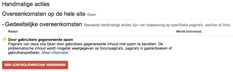 Als je een Google Penalty oploopt, krijg je hiervan een melding in Search Console. Onder de kop handmatige acties bij zoekverkeer. Hier kunnen twee typen meldingen worden weergegeven: