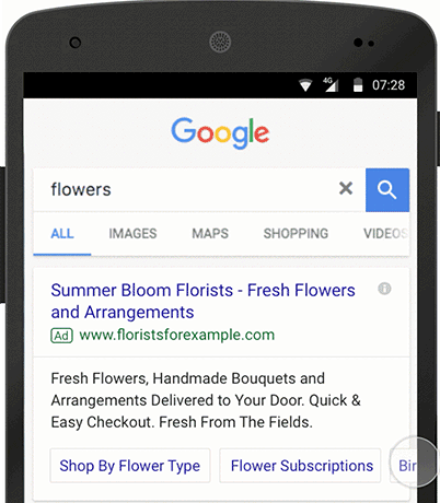Om de mobiele advertenties nog gebruiksvriendelijker te maken heeft Google de mobiele extensies verbetert. De sitelinks worden als horizontaal scrolbare buttons weergegeven. Hierdoor krijgt de bezoeker de kans om te kiezen welke sitelink het beste bij de wensen aansluit. In onderstaande animatie is te zien hoe deze ontwikkeling eruit ziet: