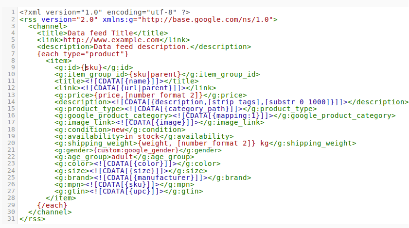 De basis voor een goede plaatsing is een productfeed. Hoe completer je productfeed, hoe beter je conversie. Dit maakt het relatief eenvoudig en efficint om een assortiment aan producten online te plaatsen. Bij een goede feed worden veel velden/attributen meegeleverd, wat de vindbaarheid ten goede komt. Het is per marketplace afhankelijk welke velden verplicht zijn. Hieronder zie je een voorbeeld van een XML productfeed.