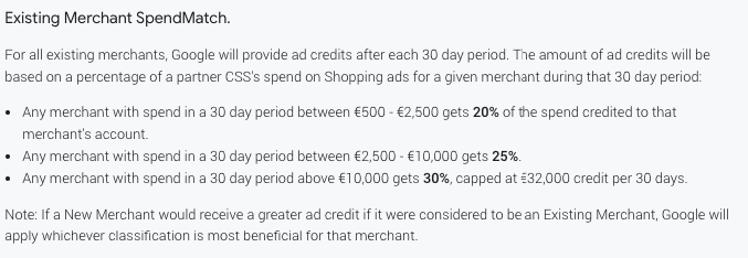 Om het CSS programma nog een stimulans mee te geven is er de Google de Merchant SpendMatch. Dit houdt in dat een adverteerder die via een CSS partner (ons in dit geval) adverteert, iedere maand tot 30% van de uitgaven als advertentietegoed krijgt teruggestort in het Google Ads account met een max van 32.000 per maand. De maximum geldt voor elke individuele CSS, dus voor een merchant met meer dan 100.000 Shopping uitgaven kan het gunstig zijn om de spend te verdelen over meerdere CSSen.