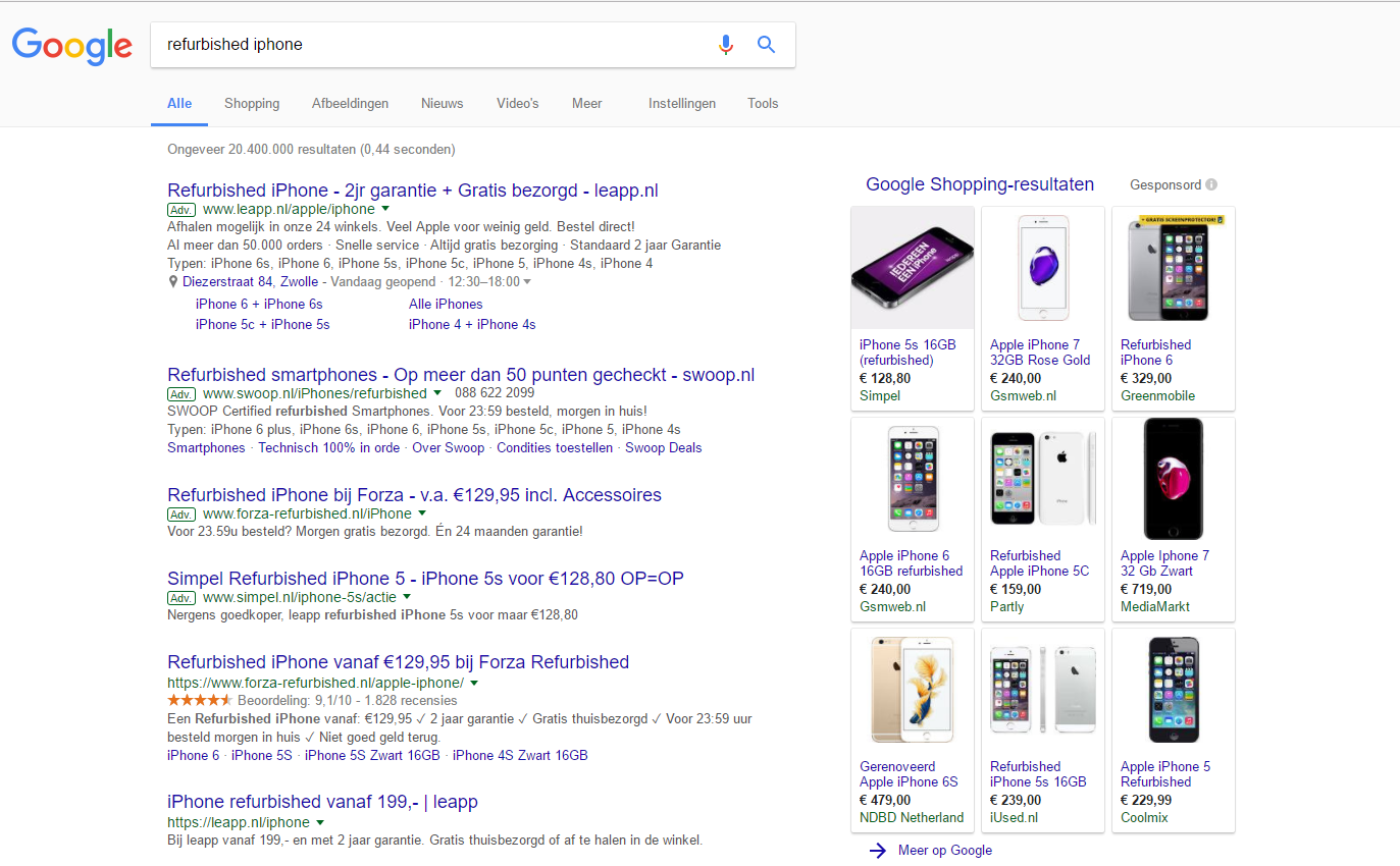 Voor generieke termen als refurbished iPhoneof groepenkastkiest Google uit meerdere producten. Door middel van n Shopping campagne op hoge prioriteit te zetten en de reguliere Shopping campagne te overbieden kan er n specifiek product worden vertoond, bijvoorbeeld een meest verkochte product of een product met de hoogste marge.
