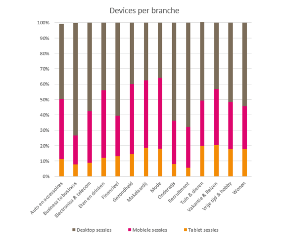 Dat steeds meer verkeer via mobiele devices verloopt is geen nieuws, maar hoe liggen de verhoudingen in de verschillende branches? Uit ons onderzoek is gebleken dat het gebruik van mobiel, tablet en desktop sterk van elkaar verschilt per branche. Business-to-businesssites wijken hierbij het meeste af, in deze branche is het aantal sessies met een desktop het hoogst, namelijk gemiddeld 72,57 procent. Mobiel komt tweede met 18,77 procent en tablet als laatste met 7,76 procent.