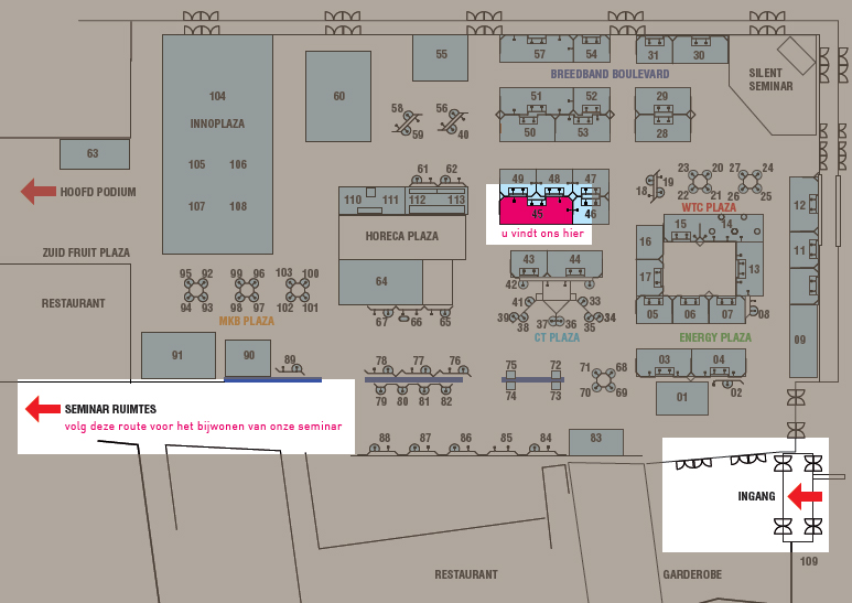 Op onderstaande plattegrond vindt u de locatie van onze stand (nr. 45) en de seminarruimte.