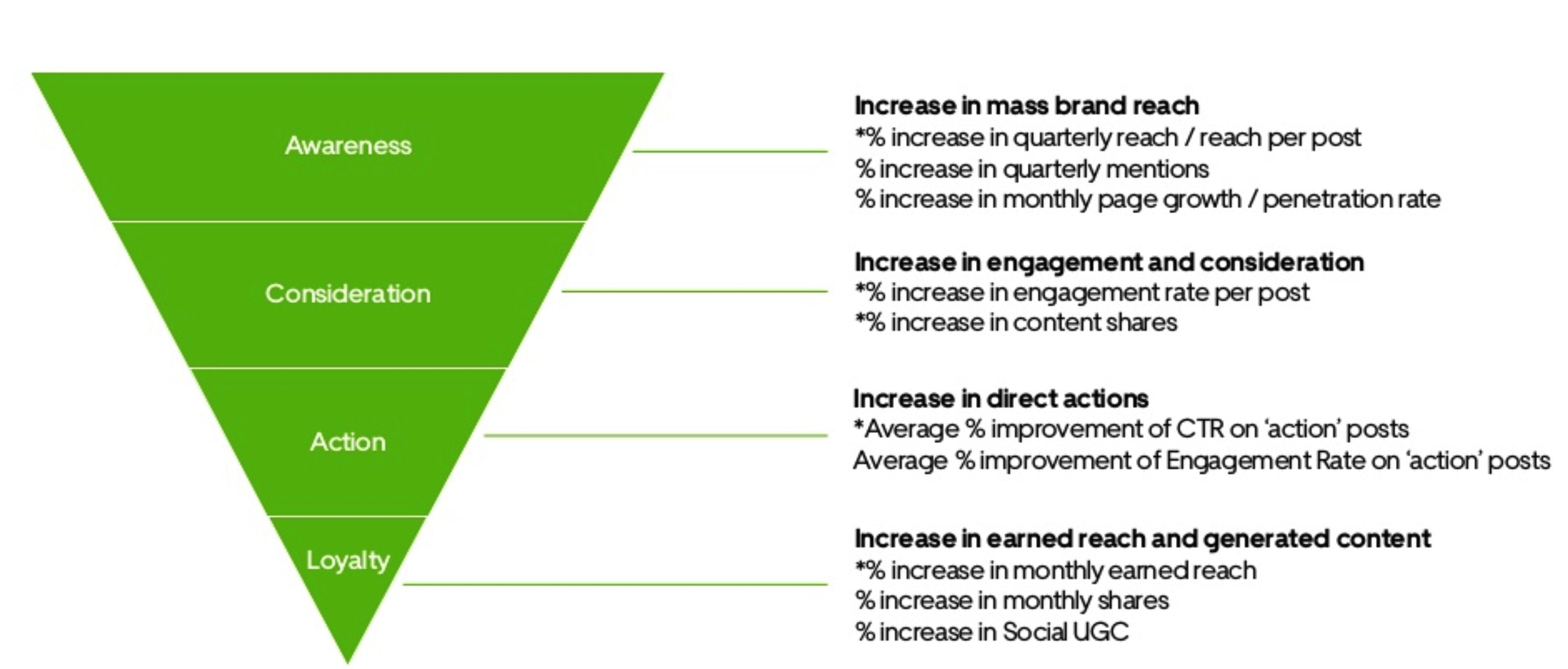 Wat zijn jouw social media doelen? Elke post dient bij te dragen aan deze overkoepelende doelen van de conversiefunnel. Meet daarvoor bedrijfsresultaten, niet alleen KPIs.
