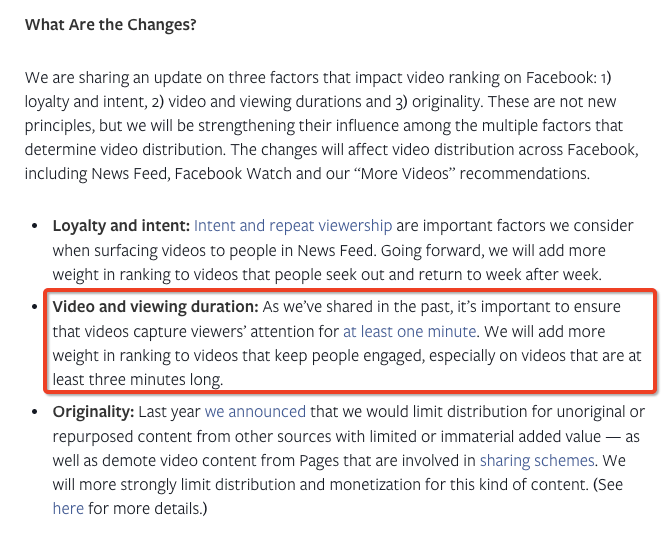 Zoals bovenstaande melding uit een nieuwsbericht van Facebook ook aangeeft: We will add more weight in ranking to videos that keep people engaged, especially on videos that are at least three minutes long. En die 3 minuten zijn geen toeval; want pas bij videos vanaf 3 minuten kunnen er zogenoemde mid-roll* advertenties worden vertoond (*advertenties die ergens halverwege een video worden getoond). Logisch dus dat Facebook de videos die langer dan 3 minuten duren voorrang geeft in het algoritme, want dat betekent meer geld voor Facebook! Mijn advies? Maak vooral videocontent die je doelgroep boeit en let niet al te veel op de duur van de video. Relevantie zit hem in de inhoud, niet in de lengte!