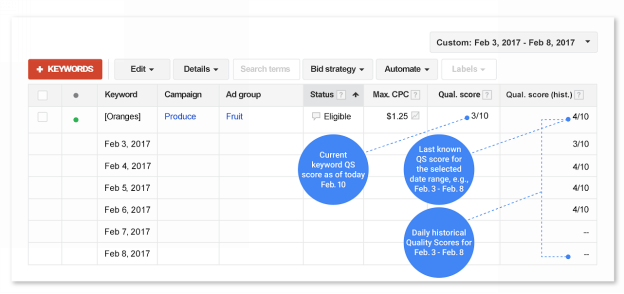 Sinds deze week heeft Google nieuwe statuskolommen voor de kwaliteitsscore toegevoegd aan Google AdWords. Hierdoor bepaal je als adverteerder nog beter hoe relevant je zoekwoorden, advertenties en bestemmingspaginas zijn door de kwaliteitsscore en de bijbehorende componenten (verwachte klikfrequentie, advertentierelevantie en ervaring op bestemmingspagina) te evalueren.