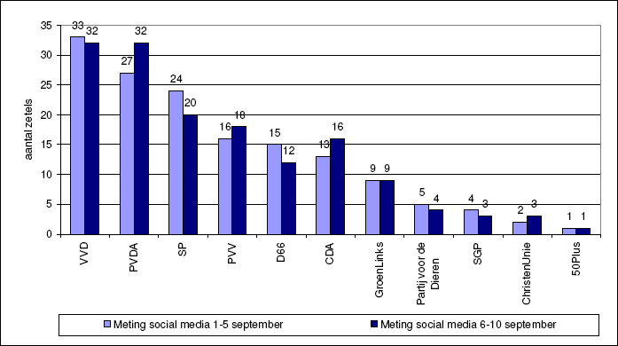 Volgens de social media analyse van 10 september komt de VVD als grootste partij uit de bus met 32 zetels. De VVD heeft hiermee de afgelopen vijf dagen wel een zetel ingeleverd. De PVDA boekt overde afgelopen vijf dagen een winst van vijf zetels en komt ook op 32 zetels. Het belooft dan ook, net alsbij de vorige Tweede Kamerverkiezingen van 2010, een nek-aan-nek race te worden tussen de VVD en de PVDA. Van de zes grootste partijen ziet de ontwikkeling op social media van het positieve sentiment, vertaald naar aantal zetels er als volgt uit.