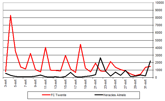 Voor Heracles Almelo bestaat de trending topics top vijf uit Ajax, Alkmaar, Utrecht, Vitesse en De Kuip. In bovenstaand figuur is goed te zien dat er veel is gecommuniceerd over de wedstrijd tegen AZ op 22 maart en de verloren partij tegen Ajax (maar ook de wedstrijd van Jong Heracles tegen Jong Ajax speelt hier een rol).