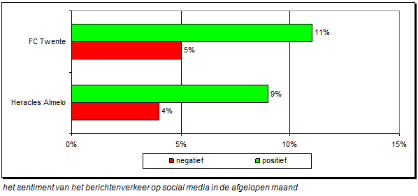 Over de afgelopen maand ontlopen beide clubs elkaar nauwelijks qua sentiment van de berichten. FC Twente kent een iets groter aandeel van positieve berichten over de club, maar ook het aandeel negatieve berichten ligt een procent hoger dan bij Heracles Almelo. Op de dag dat Heracles Almelo van AZ won scoorde de club 14% positieve tegenover 2% negatieve berichten. Ook FC Twente kent dagen met veel positief sentiment. Na de gewonnen uitwedstrijd tegen PSV op 4 maart had 15% van het berichtenverkeer over de club een positief sentiment.