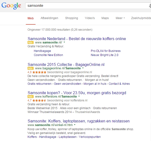 Bijkomend voordeel is dat zodra je zelf gaat adverteren de kwaliteitscore van de concurrent zal dalen, aangezien jouw CTR een stuk hoger is. Hierdoor gaan concurrenten veel meer per klik betalen. Zo ontmoedig je concurrenten om op jouw merknaam te blijven adverteren.Zie bijvoorbeeld Samsonite: