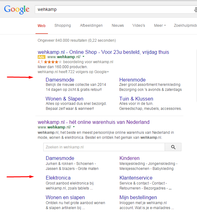 Zie onderstaande voorbeeld waarbij de betaalde advertentie met uitgebreide sitelinks en het organische resultaat met sitelinks alle ruimte boven de vouw inneemt.