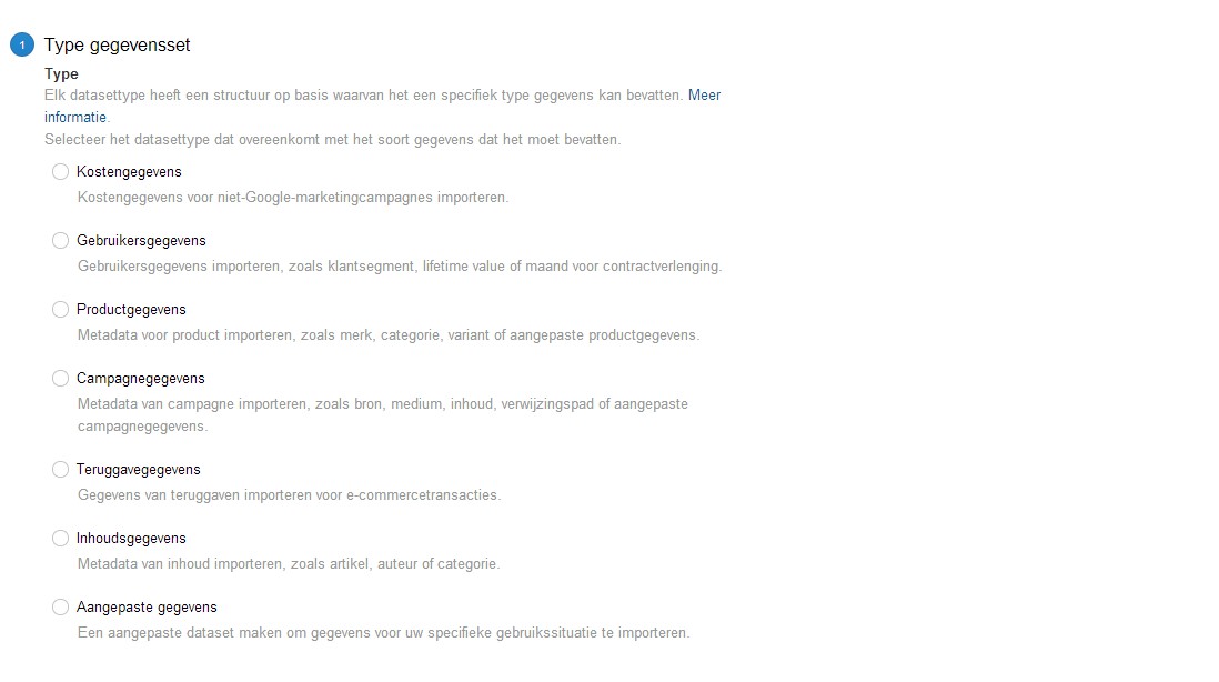 Iets waar veel gebruikers al even op wachten is het importeren van data in je Google Analytics profiel. Het is al even mogelijk kostengegevens te importeren in je Google Analytics profiel, maar tijdens de Summit is aangekondigd dat deze functionaliteit wordt uitgebreid met veel opties. Een functionaliteit die naar verwachting veel gebruikt zal gaan worden. Voor veel Universal Analytics gebruikers zijn deze opties direct beschikbaar: