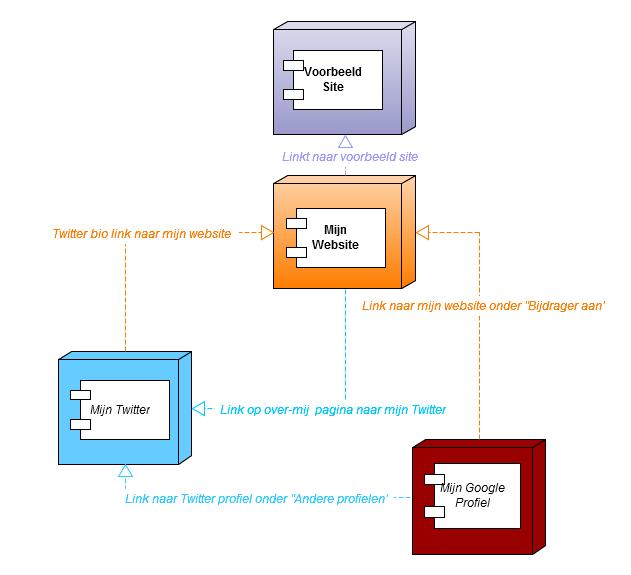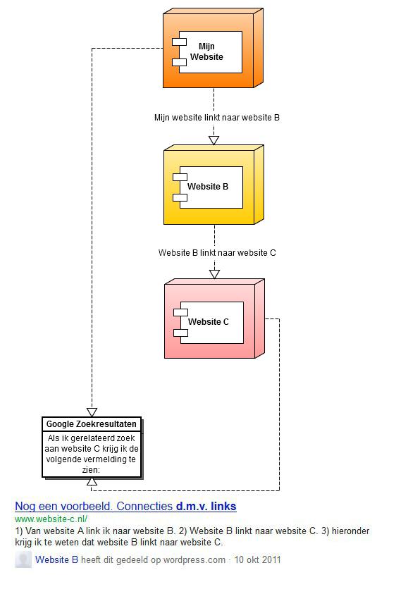In de zoekresultaten laat Google niet alleen zien naar welke sites jij linkt, maar ook waar de sites waar jij naar linkt naar toe linken. De volgende illustratie maakt dat duidelijk.