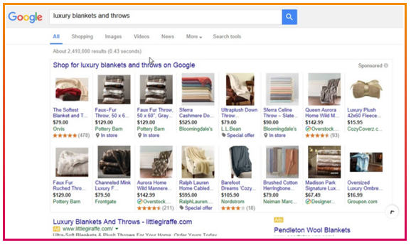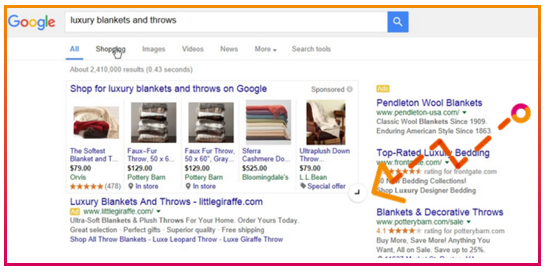 In het screenshot hieronder zie je een voorbeeld van de button die wordt weergegeven om de Google Shopping-resultaten uit te breiden. De advertenties aan de rechterkant worden naar beneden gedrukt door deze uitbreiding zoals onderstaand voorbeeld. Vanwege het succes van Google Shopping, is Google bezig om het succes van Google Shopping verder uit te breiden. Uit onderzoek van Merkle RKG blijkt zelfs dat de gemiddelde CTR voor Shopping-resultaten 90% hoger ligt in vergelijking met tekstadvertenties.