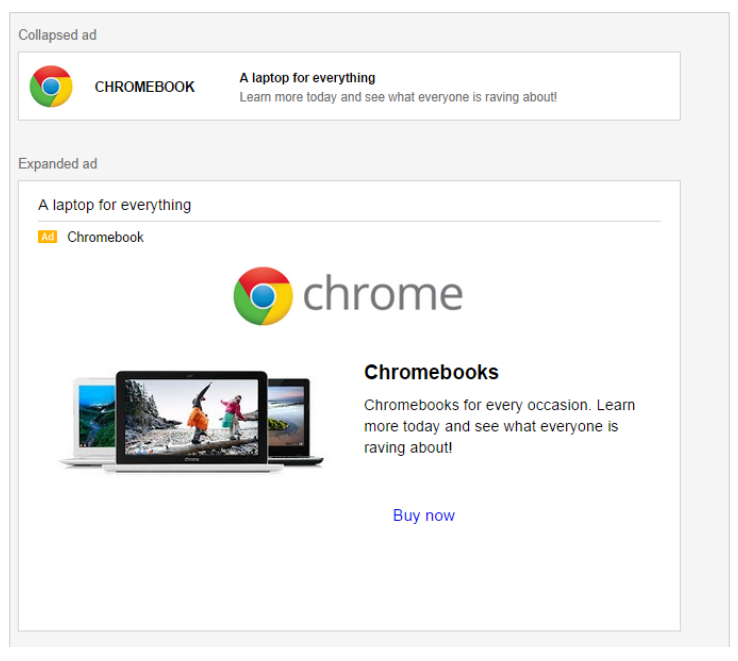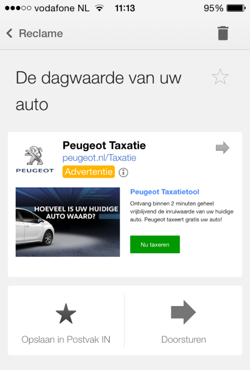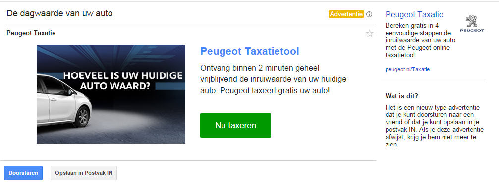 De extended ad kan bestaan uit tekst, afbeeldingen, links (naar je website), formulieren of videos en lijkt op een normaal emailbericht. De ad kan worden opgeslagen in je postvak in of doorgestuurd worden: