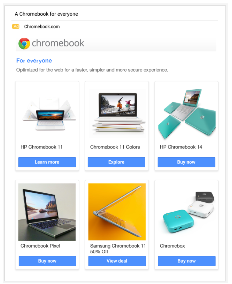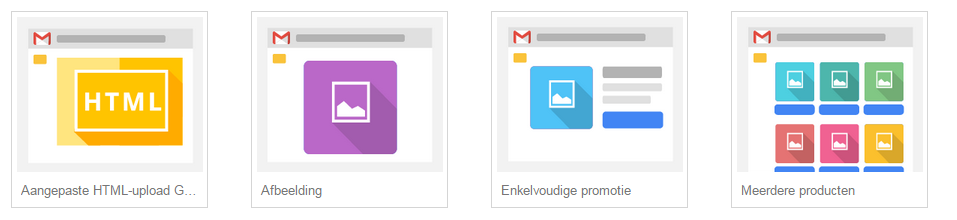 Sinds de overgang van GSP naar de AdWords-interface biedt Google de mogelijkheid om te kiezen uit 3 standaardsjablonen. Hiernaast kun je ook nog steeds je eigen aangepaste HTML-upload doen.De standaardsjablonen zijn: afbeelding, enkelvoudige promotie en meerdere producten.