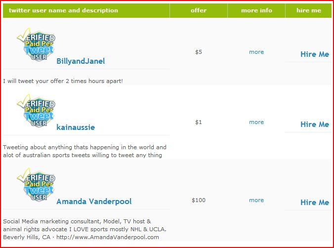 Ook het verkrijgen van valse Tweets wordt steeds gemakkelijker. Via de het voorbeeld in de bovenstaande afbeelding, kan je mensen inhuren. Deze personen zullen voor een bepaald bedrag positieve tweets plaatsen, waardoor het imago verbeterd en de naamsbekendheid van een bepaalde organisatie zal worden vergroot.