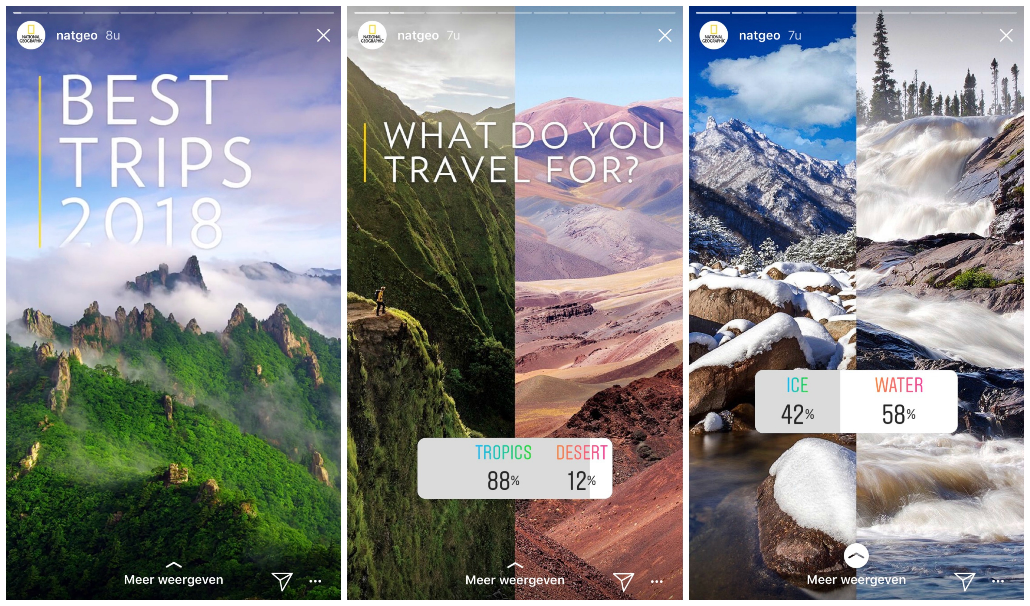 Daniel Wellington (@danielwellington) maakt gebruik van user generated content. Elke dag kiezen zij een #DWPickoftheDay, reposten fotos en af en toe posten ze eigen content. Op deze manier creren ze heel gemakkelijk een mooie Insta-feed. Ook National Geographic (@natgeo) doet het erg goed op Instagram. Zij hebben een heel eigen manier van Insta-story gebruik ontwikkeld waarmee ze op een leuke manier bruikbare informatie verzamelen.