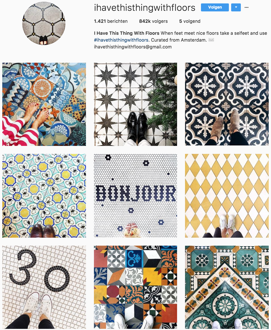 Wanneer je eenmaal goede dagen en tijden gevonden hebt om te uploaden is het een uitdaging om je volgers geboeid te houden. Je wilt namelijk niet dat mensen je gaan volgen en je vervolgens weer gaan verlaten. Het is daarom leuk om verschillende mini-series te starten. Op deze manier weten je volgers waarom ze je volgen en het maakt je feed boeiender omdat je volgers nieuwsgierig zijn naar waar je verhaal of serie naartoe gaat. Bekijk bijvoorbeeld de mini-serie van Gabriela Mateus (@gmateus) die verschillende kleurrijke gebouwen in beeld brengt. Of kies n bepaald onderwerp net als dat @ihavethisthingwithfloors dat gedaan heeft. Elke dag zijn haar duizenden volgers weer benieuwd wat voor vloer er die dag weer op Instagram zal verschijnen. Naast je fotos kun je het beeld ook nog ondersteunen door een gezellige, pakkende tekst. Hierin kun je dan je gevoelens of gedachten delen met je volgers en de interactie aangaan.