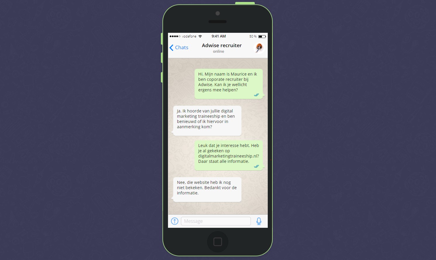 Wil je op de hoogte gehouden worden over alle ontwikkelingen op het gebied van e-Recruitment? Dat kan nu ook via ons WhatsApp kenniskanaal. App Recruitment aan naar: 06-22078053 en je wordt automatisch op de hoogte gehouden van alle trends op het gebied van eRecruitment! Afmelden gaat ook eenvoudig door 'Recruitment uit' in een WhatsApp bericht naar ons te sturen.