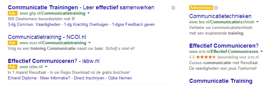 We kijken niet alleen naar de ervaringen op de website, maar ook hoe men op de website komt. Vaak start een zoektocht via Google. Wat recentelijk opvalt, is dat testers bekend zijn met Adwords resultaten (de bovenste drie en de rechterkolom) en daar doelbewust niet op klikken. De argumenten:
