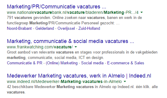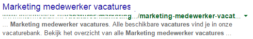 Relevant zijn gaat veel verder dan je zou denken. Het begint namelijk al met hoe je vacature wordt weergegeven in de zoekresultaten van Google. De gebruiker geeft een zoekopdracht en zoekt tussen de gevonden resultaten naar herkenning in de functietitel. Zover gaat het meestal wel goed. Maar vervolgens verwacht de gebruiker in het onderschrift direct al meer informatie over de functie te lezen te krijgen. En op die behoefte wordt lang niet altijd goed ingespeeld. Onderstaand twee voorbeelden.