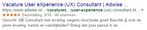 Om te kunnen bepalen of een vacature relevant is, is het ook belangrijk dat je zorgt voor onderscheidend vermogen. Niet alleen in je websites, maar juist ook al in de weergave van je advertentie(s) in de zoekresultaten. Dit kun je bijvoorbeeld doen door het tonen van extra informatie bij je advertentie of door gebruik te maken van visuals. Kijk maar eens naar onderstaande twee voorbeelden. In het eerste voorbeeld is er geen sprake van onderscheidend vermogen. Alle advertenties lijken op elkaar. Gevolg: de gebruiker kan niet direct een keuze maken met als gevolg dat men de gevonden resultaten dus maar van boven naar onder afwerkt.
