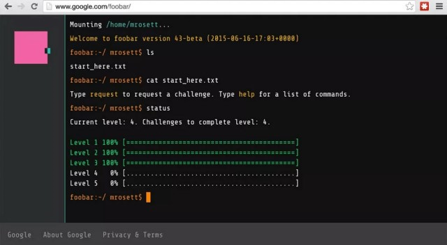 Er verscheen een kader in zijn scherm met een speciale tekst: Jij spreekt onze taal. Heb je zin in een uitdaging? Max had hier wel oren naar en kwam terecht op de site: http://www.google.com/foobar/