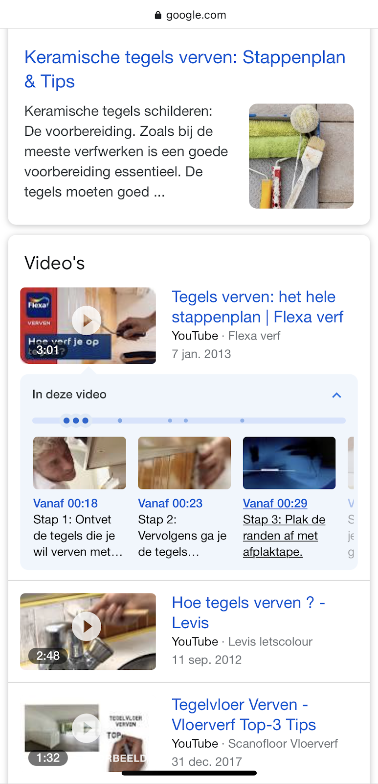 Worden er verschillende stappen/onderwerpen benoemd in de video? Geef ze dan een tijdsaanduiding. Hierdoor verschijnt er namelijk een overzicht met de verschillende onderwerpen in de zoekmachine incl. een ‘vanaf tijd’. Dit bevordert niet alleen de gebruiksvriendelijkheid, maar ook de zichtbaarheid, aangezien dit prominent in de zoekmachine wordt weergegeven.