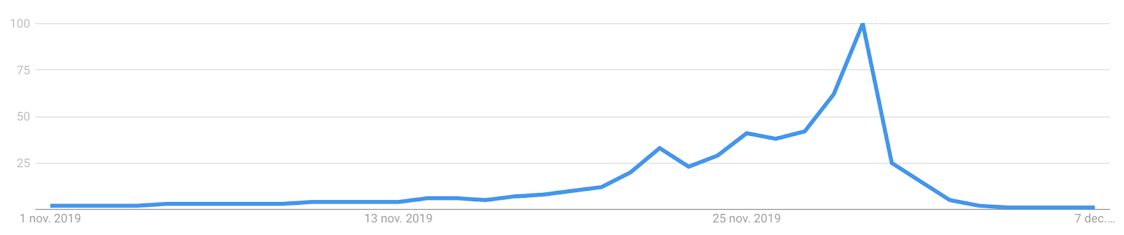 De oriëntatiefase start gemiddeld een week voor Black Friday, zie de zoekvolumes in de grafiek hieronder. Zorg ervoor dat je een week van te voren begint met het informeren over jouw goede Black Friday deals. Zet alle kanalen in en zorg voor een relevante boodschap per kanaal.