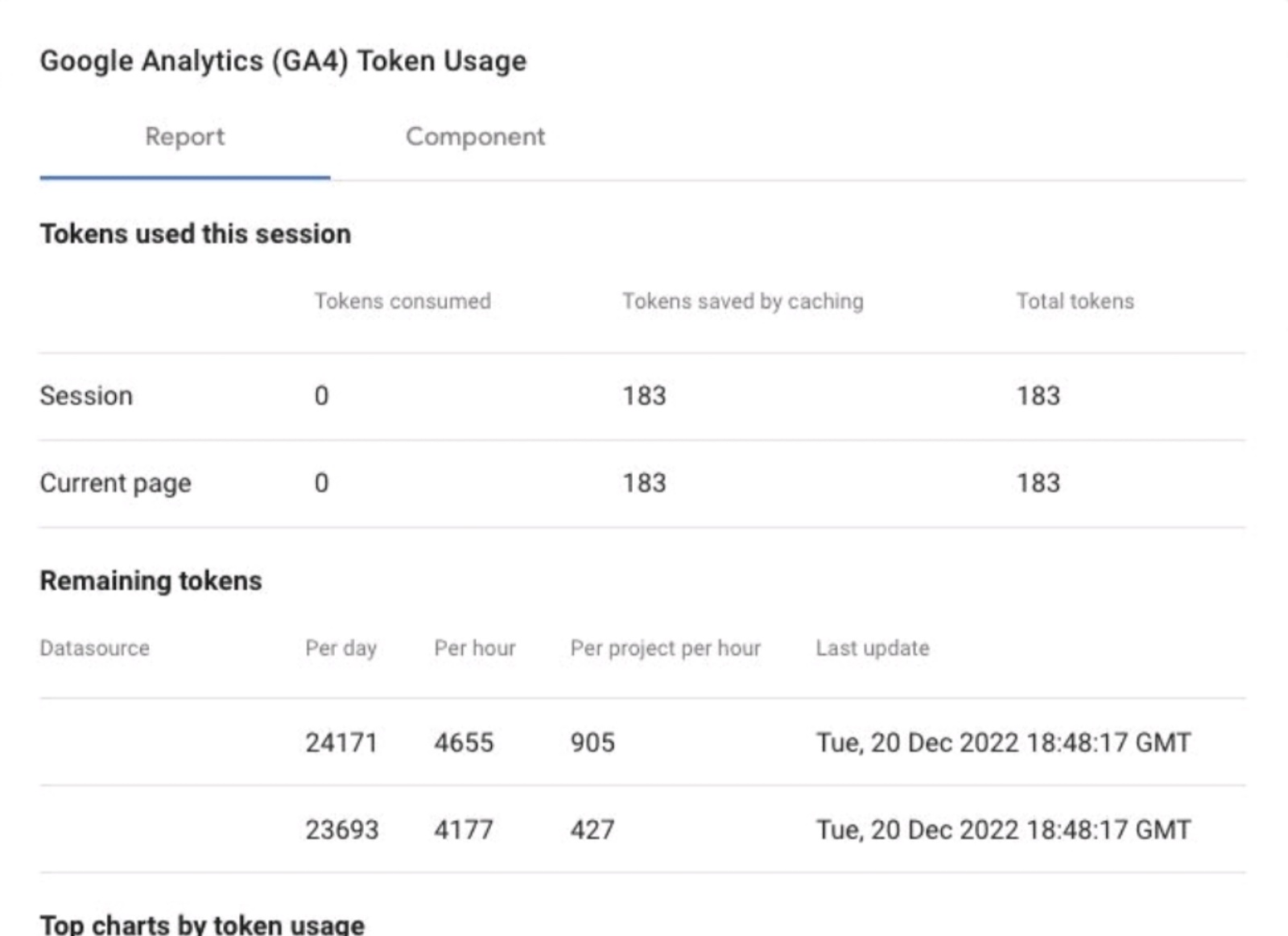Klik met rechtermuisknop op een grafiek en bekijk het ‘Google Analytics Token Usage’ rapport. Je krijgt dan inzicht in onder andere token verbruik, resterende tokens en welke grafieken de meeste tokens verbruiken.