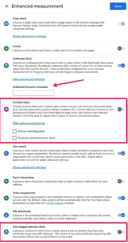 Begin deze maand zien we via diverse kanalen screenshots voorbij komen waarbij het erop lijkt dat er mogelijk nieuwe statistieken beschikbaar komen in Google Analytics 4. Bijvoorbeeld ‘content views’, de optie voor ‘outbound exclusion domain’ en ‘data-tagged element clicks’. Deze laatste lijkt vooral veel voordelen te bieden voor developers om metingens vanuit de code toe te voegen. Maar wat de exacte uitrol zal zijn, hebben we nog niet meer informatie over gevonden. Toch goed om dit de komende tijd in de gaten te houden! Onderstaand alvast een sneak preview hiervan: