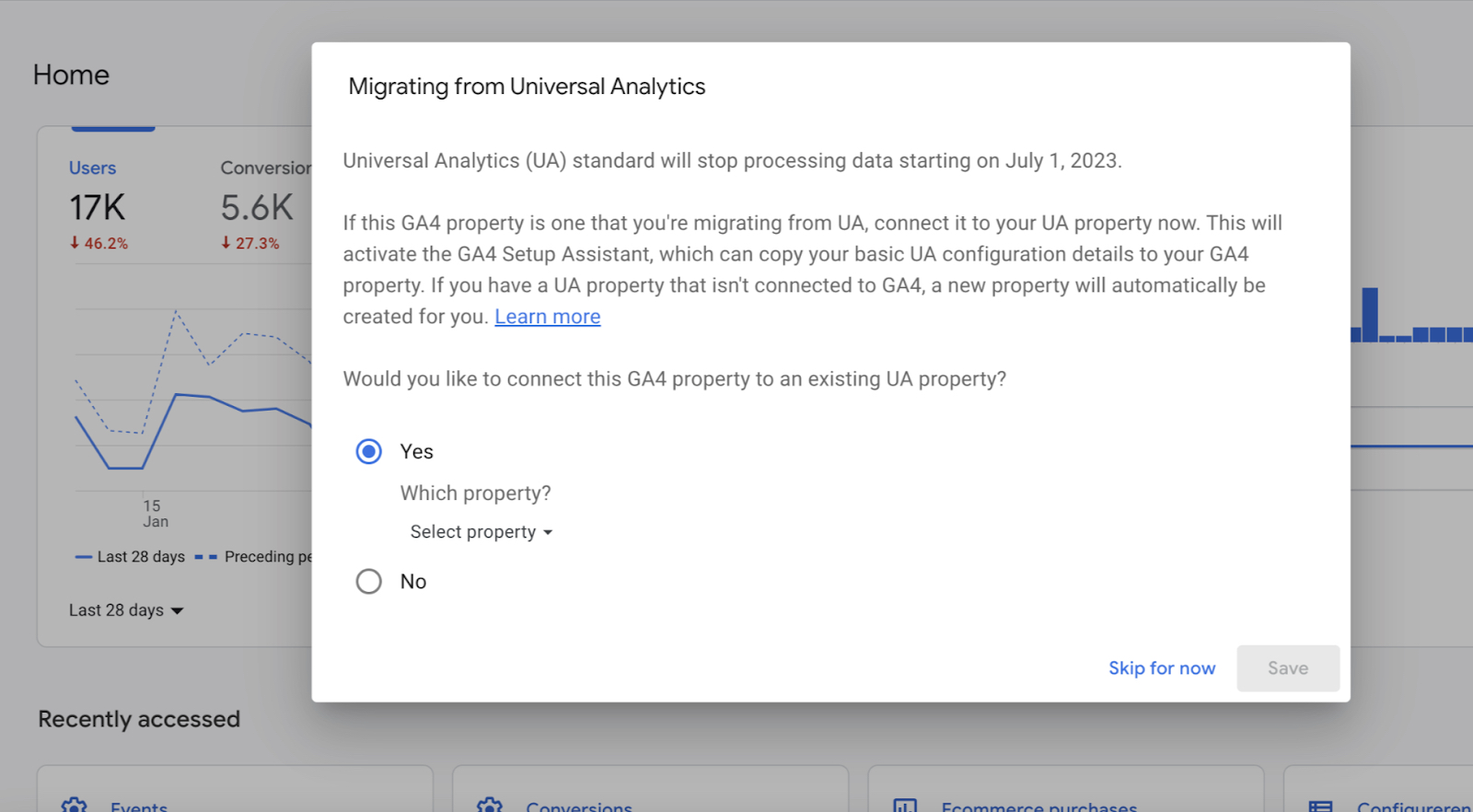 Maak je al gebruik van Google Analytics 4 (GA4) en heb je Google Analytics Universal nog niet gekoppeld? Grote kans dat je onderstaande melding krijgt. Deze melding houdt in dat, als je akkoord heeft, er een nieuwe GA4 property wordt aangemaakt. Dit is natuurlijk niet nodig als je al een lange tijd een GA4 property hebt draaien. Om dit te voorkomen kun je op ‘no’ klikken of via je Universal instellingen, wijzigingen doorvoeren.