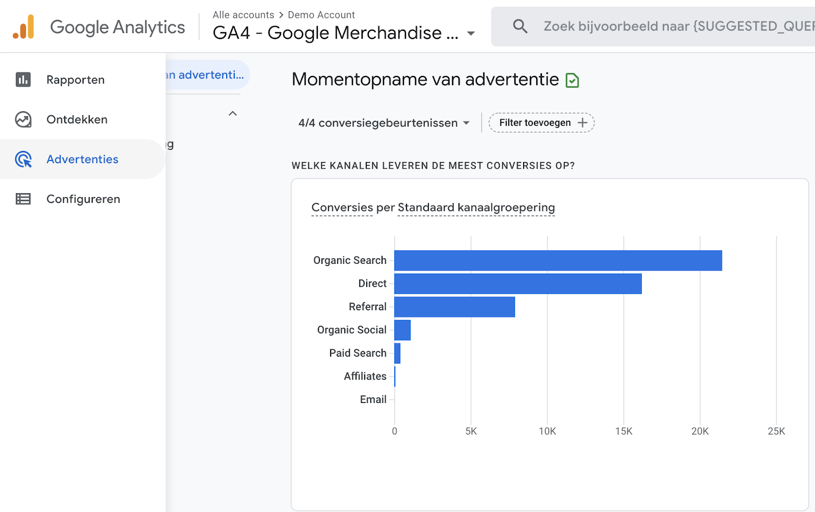 (Nieuwe interface van GA4 met onder andere een afzonderlijk tab voor Advertenties)