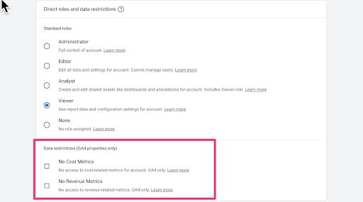 Nog meer GA4-nieuws! Zo is het straks wellicht mogelijk om in te stellen dat bepaalde gebruikers geen kosten- en opbrengstcijfers mogen zien.