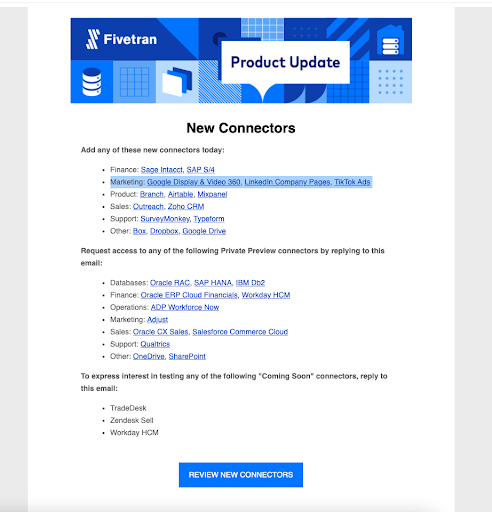 Fivetran had al veel connectors voor het ophalen van data, maar deze lijst is nog verder uitgebreid met DV360, LinkedIn Company Pages en TikTok Ads. We maakten al gebruik van de beta voor DV360 voor een aantal opdrachtgevers.