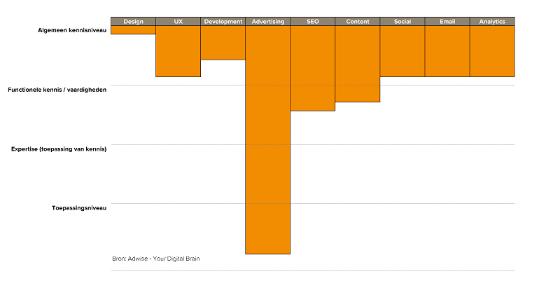 Een T-Shaped marketing professional is een marketeer met een brede basiskennis en diepgaande kennis van één of meerdere specialismen. Onderstaand model geeft het T-Shaped principe goed weer. De T-vorm is duidelijk te zien in het model.