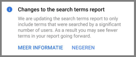 Google voert een update door in het rapport zoektermen, ofwel een update in het rapport dat laat zien welke zoekopdrachten gebruikers hebben uitgevoerd voordat een advertentie werd uitgeserveerd. Google geeft aan dat per september 2020 alleen zoektermen worden getoond die zijn gebruikt door een significant aantal gebruikers. Gevolg is dat minder zoektermen worden weergegeven in het rapport. Adverteerders krijgen dus minder inzicht in het zoek- en klikgedrag van hun doelgroep.