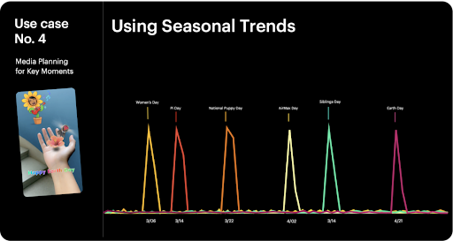 Naast de concepten die hierboven benoemt staan is Snapchat Trends interessant om seizoenstrenden te herkennen. Denk bijvoorbeeld aan een nationale ijsdag of internationale vrouwendag. Voor ieder merk is het interessant om zo’n key moment eigen te maken.