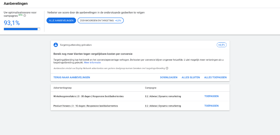 We adviseren niet om alle aanbevelingen die worden gegeven blindelings door te voeren. Mogelijk heb je er bewust voor gekozen om bepaalde audiences niet te targeten of passen de aanbevelingen niet bij het budget dat je als adverteerder beschikbaar hebt.