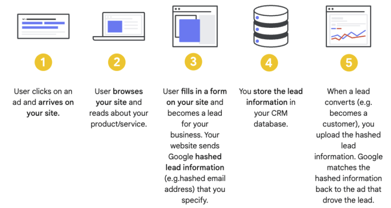 Om bovenstaande reden heeft Google enhanced conversions voor leads in het leven geroepen. Wanneer een potentiële klant een formulier op jouw website invult, ontvang je waarschijnlijk first-party data zoals een e-mailadres, naam of adres. Deze data kan worden afgevangen via jouw Google Ads tag, vervolgens worden gehashed en weer naar Google verstuurd. Wanneer deze lead vervolgens daadwerkelijk converteert dan stuur je deze data naar Google en zal Google deze matchen aan de lead informatie die het eerder uit het formulier heeft opgehaald.