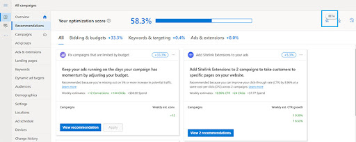 Zoals al verteld, kunnen adverteerders ten alle tijden ‘opt-outen’ van de Auto Applied Recommendations. Dit doe je door naar het Aanbevelingen tabblad te browsen en vervolgens rechtsboven op de bliksemschicht te klikken. Hier kun je vervolgens kiezen welke aanbevelingen je wel en niet meer wilt toepassen.