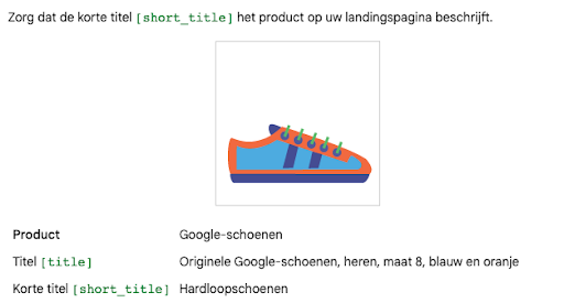 Vereisten voor een korte titel. Hoewel Google 1-150 tekens voor dit veld toestaat, raadt het aan om tussen de 5 en 65 tekens te gebruiken. Google adviseert verkopers ook: