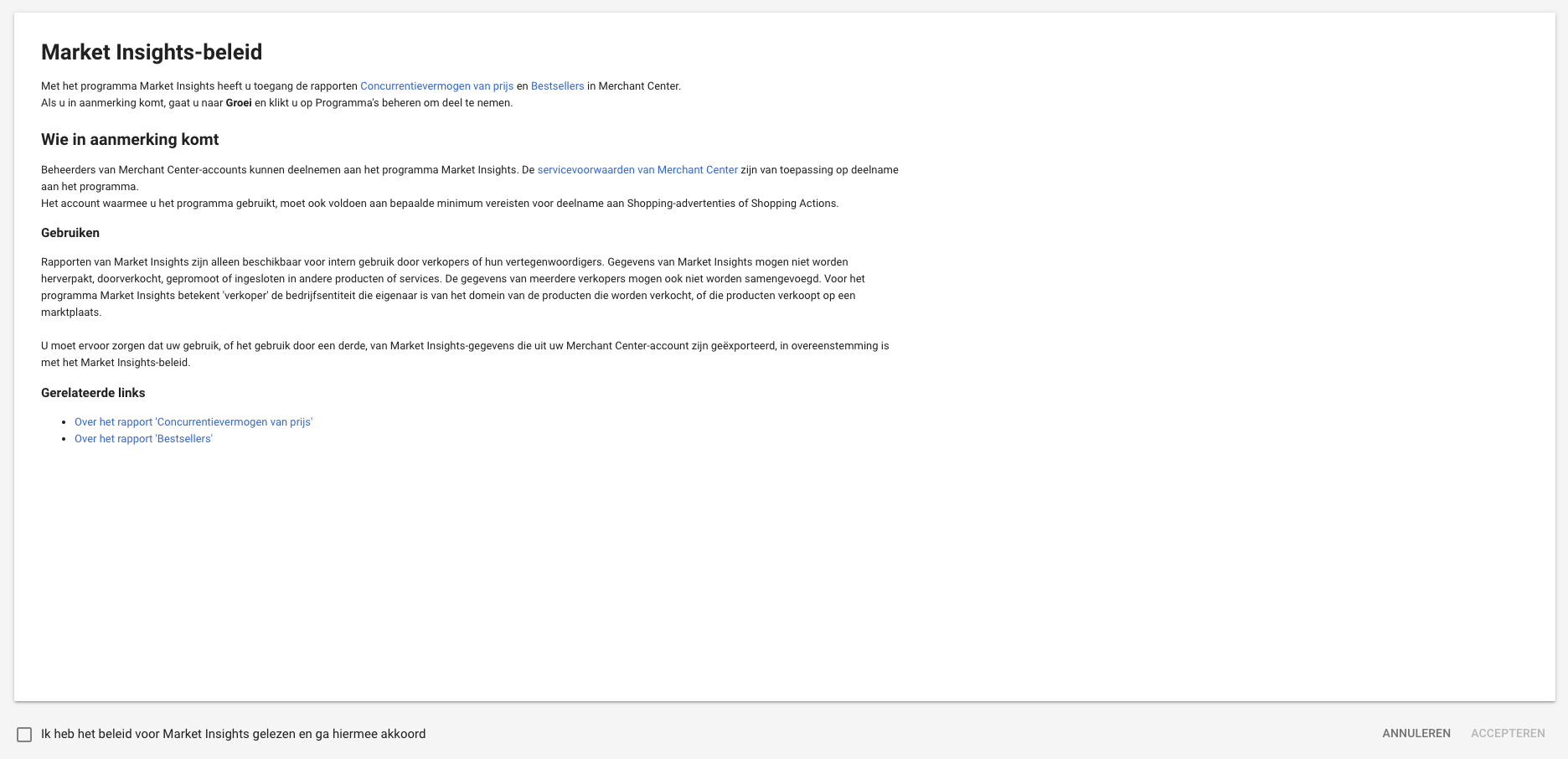Wil je deze rapporten kunnen inzien dan dien je eerst het Market Insight-beleid te accepteren binnen het Google Merchant Center. Wanneer je het Market Insight-beleid hebt geaccepteerd, kun je gebruikmaken van beide rapporten.