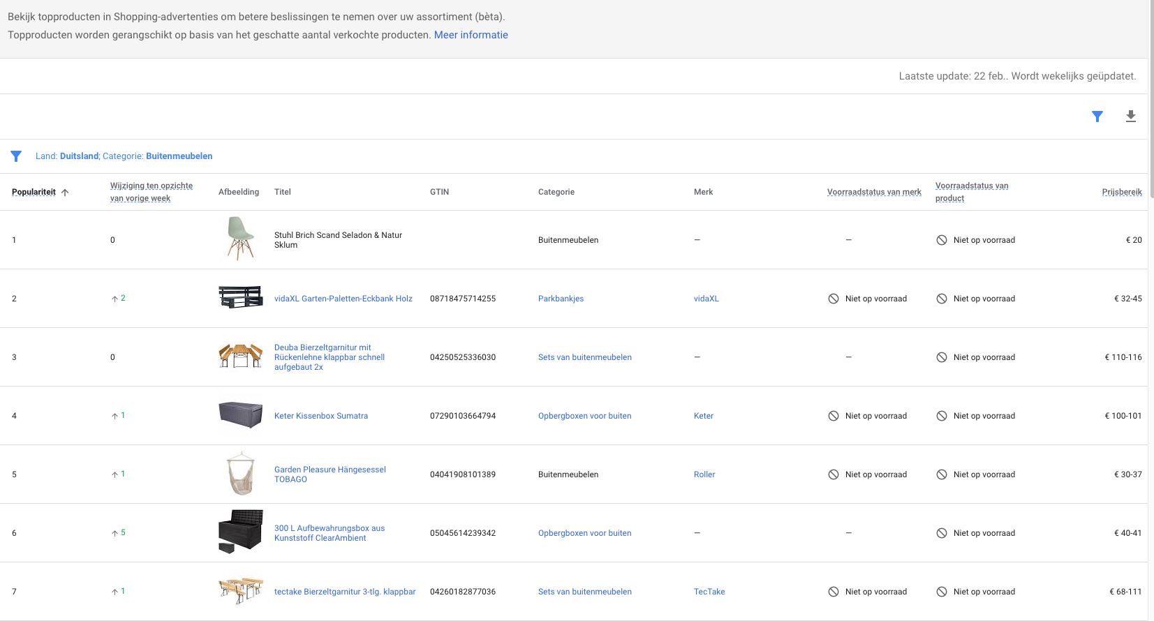 In het rapport ‘Bestsellers’ zie je als adverteerder merken en producten die populair zijn in Google Shopping. De gegevens worden gegroepeerd op basis van de Google productcategorie. In het rapport worden alleen nog producten weergegeven die populair zijn in de Verenigde Staten, Duitsland, Frankrijk en Verenigd Koninkrijk. Deze selectie aan landen wordt op korte termijn verder uitgebreidt.