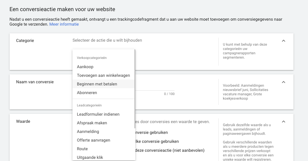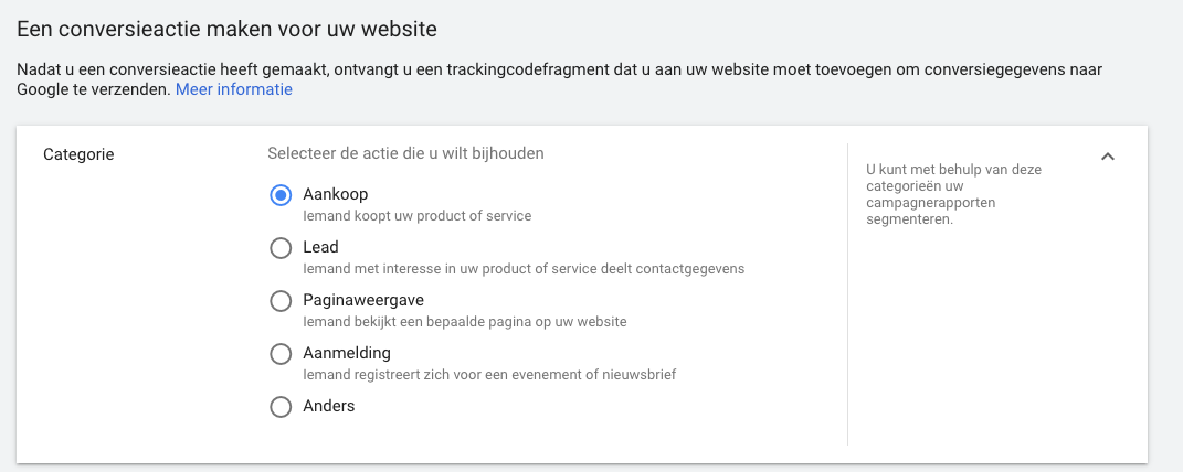 Google heeft recent een update doorgevoerd voor het bijhouden van website conversieacties. Voorheen had je als adverteerder de keuze uit een vijftal opties om je conversieactie te categoriseren.