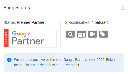 Google gaat eind juni een update doorvoeren in de vereisten voor een Partner-badge. Zo wordt er een wijziging doorgevoerd in het aantal certificeringen waarover bedrijven dienen te beschikken en worden prestaties mede beoordeeld aan de hand van de Optiscore. Daarnaast kent Google jaarlijks Premier-statussen toe aan de 3% best presterende deelnemers. Deze moeten elk jaar opnieuw worden behaald. Premier Partners worden, zo zegt Google, gekozen op basis van meerdere factoren, waaronder jaarlijkse advertentie-uitgaven voor de beheerde accounts, klantgroei en klantbehoud.