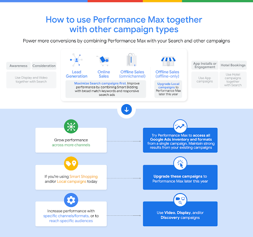 Het gebruik van Smart Shopping en Local campaigns blijft mogelijk totdat alles later dit jaar geupgrade wordt naar Performance Max. Mocht je een nieuwe campagne op willen zetten. Kies dan direct voor het Performance Max type. Op deze manier kun je dezelfde platformen gebruiken zoals bij Smart Shopping en Local, plus nieuwe voorraad en formaten.