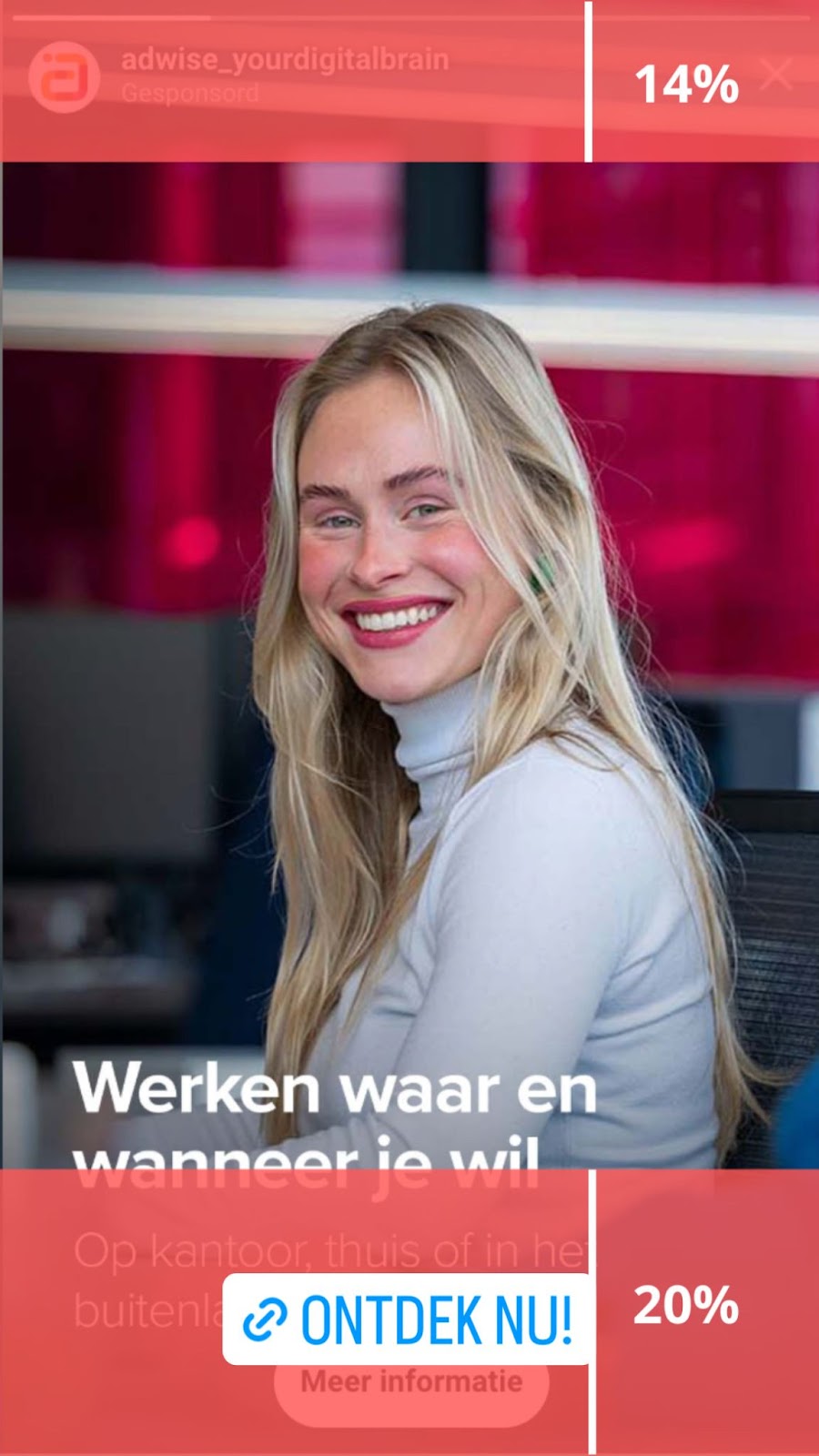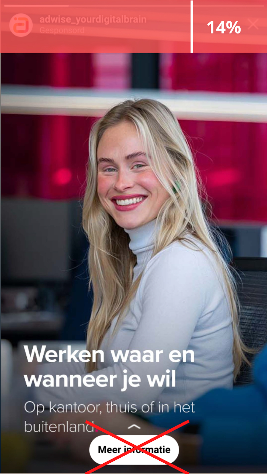 Om te voorkomen dat jouw tekst achter de nieuwe CTA link sticker verdwijnt in Instagram Stories, moet je ongeveer 20% van de onderkant van de visual vrijlaten. Plaats geen tekst, logo of andere belangrijke elementen in de 20% ruimte. Als de belangrijkste tekst of elementen van een visual in deze gevarenzone worden geplaatst, zullen ze niet leesbaar zijn. Dit kan leiden tot minder effectieve advertenties.